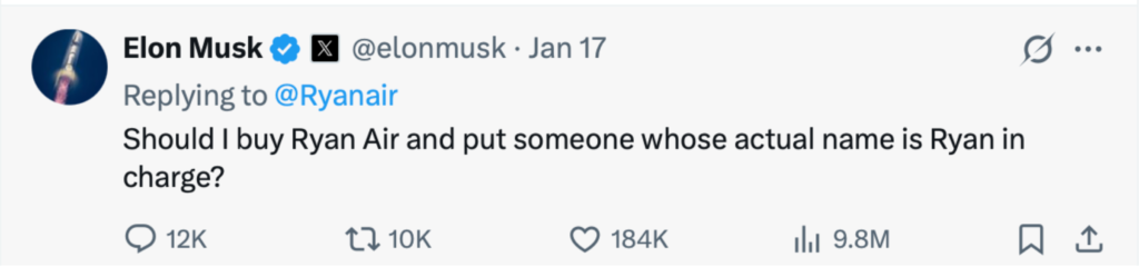 Musk fired back on his social media platform X, calling O’Leary an “utter idiot” and questioning whether the airline’s leadership should be replaced. “Fire him,” Musk wrote, while also floating the idea of acquiring the airline and appointing new leadership, asking his followers in a poll whether he should buy Ryanair.